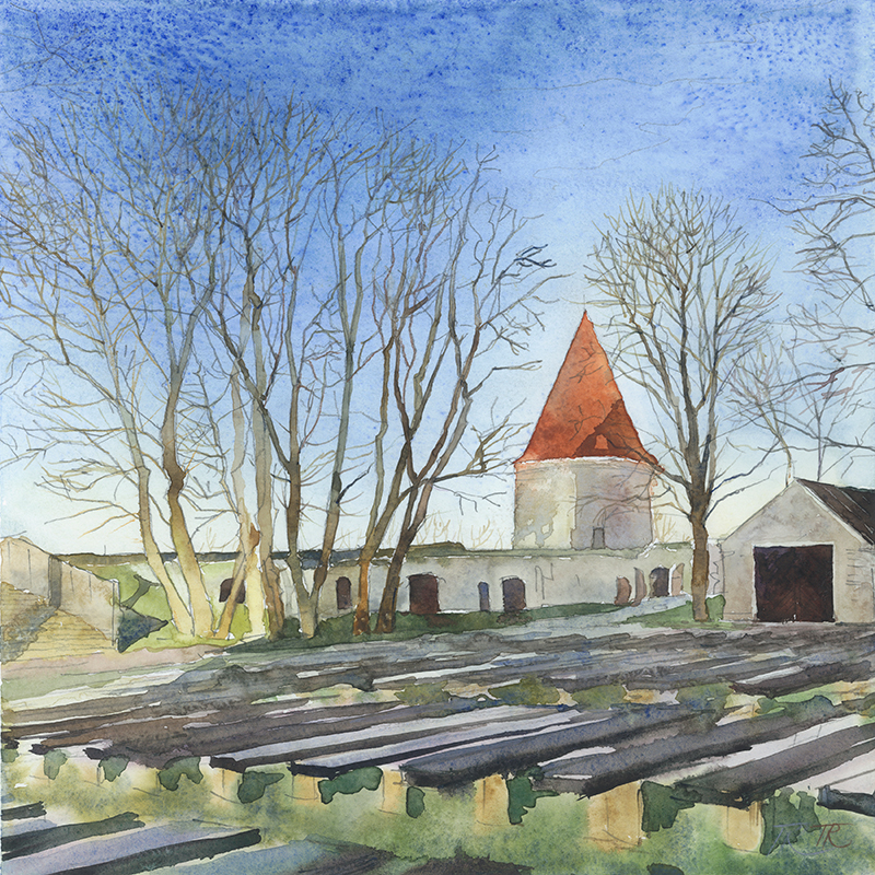 Original watercolor cityscape painting depicting scen in the park near the old castle. It is the open air concert hall. This is a famous local sight. Painted in Kuressaare, located on the island of Saaremaa in Estonia. Created on watercolor paper, followed by a sticker on cardboard.
