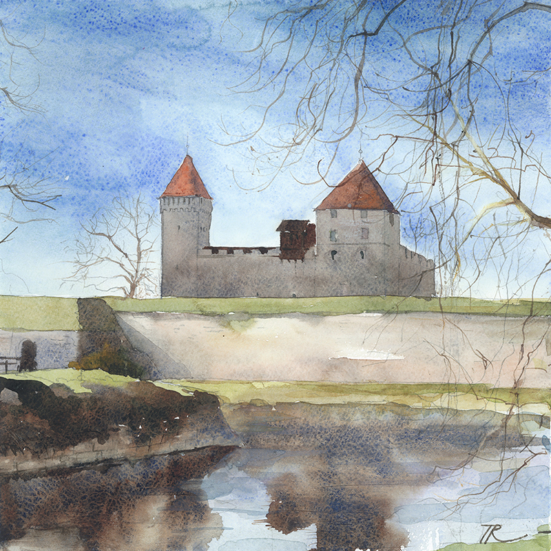 Original watercolor cityscape painting depicting Kuressaare Episcopal Castle. This local sight is one of the most popular. Painted in Kuressaare, located on the island of Saaremaa in Estonia. Created on watercolor paper, followed by a sticker on cardboard